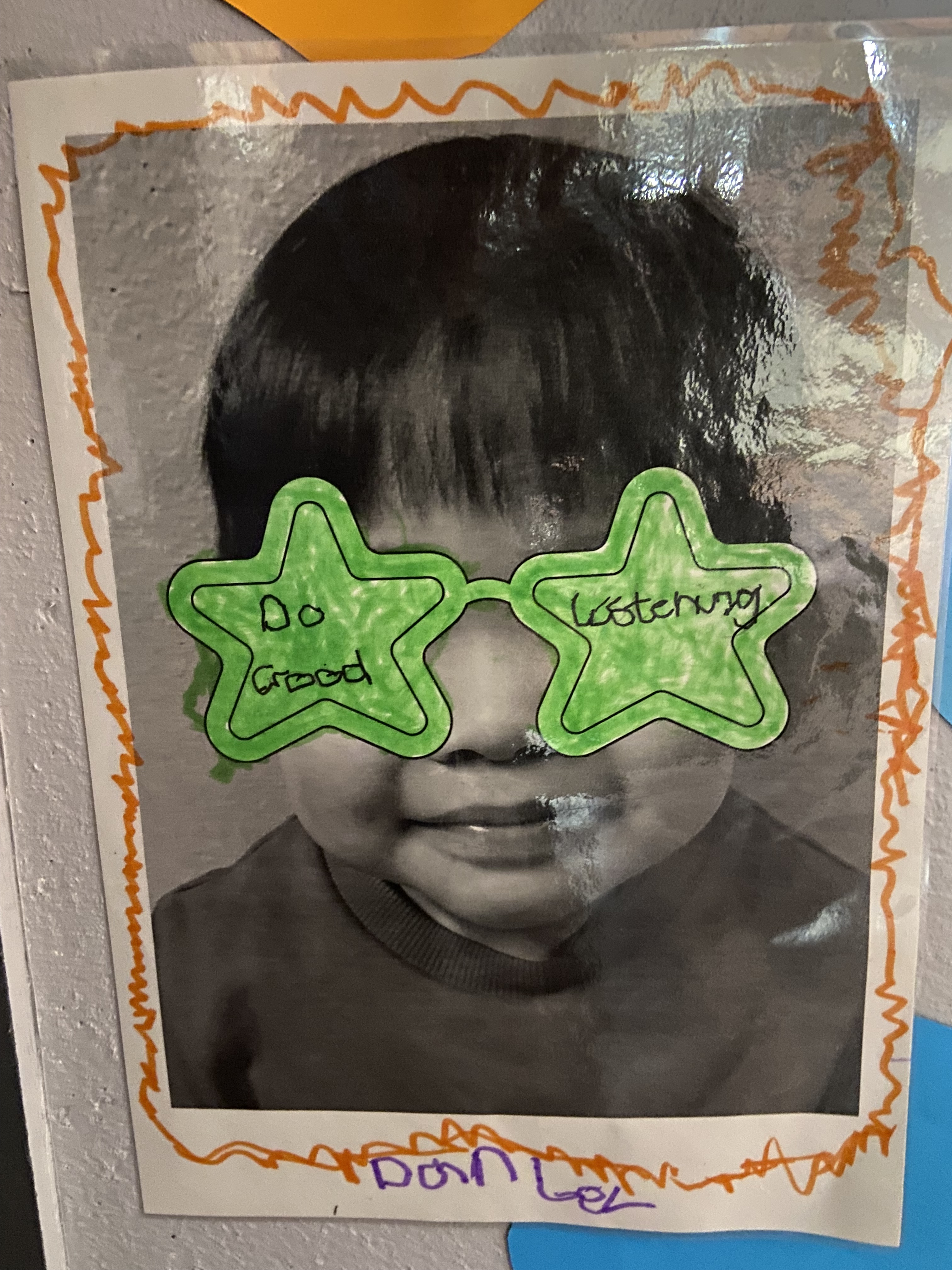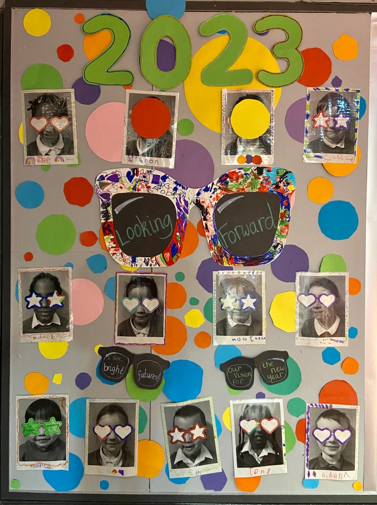 We have been ‘looking forward’ and setting new years resolutions. Sadly it is tricky to see on the photos due to the gold glitter pen used and lamination of the work. We hope you can see it up close soon!